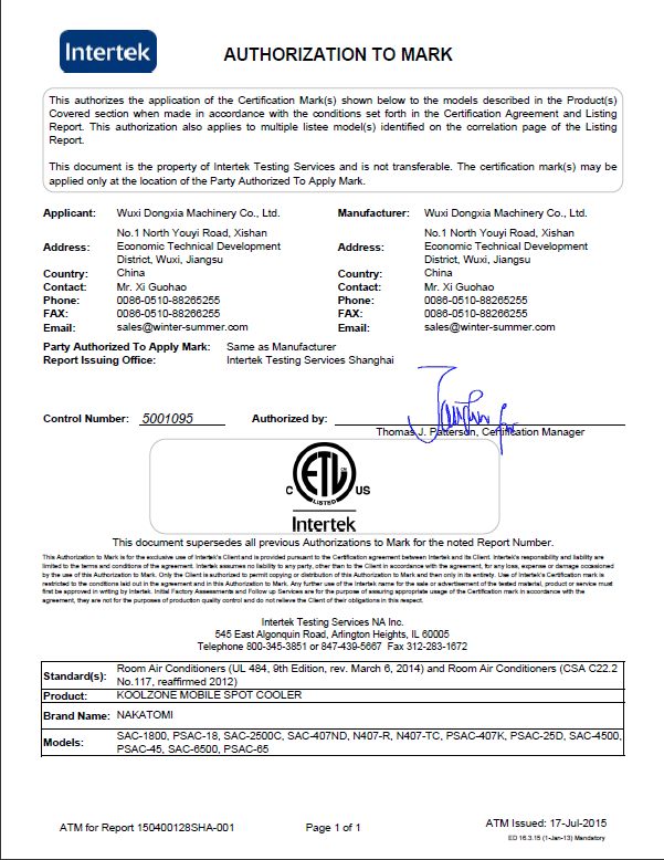 米兰体育在线网站-米兰(中国)近日宣布公司移动式工业冷气机获得的质量与安全第三方机构天祥实验室(世界上规模的消费品测试、检验和认证公司之一)颁发的ETL认证。